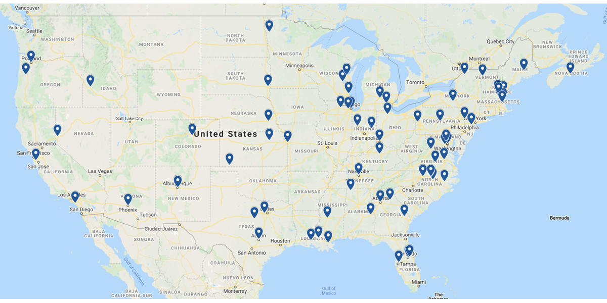 Then there's geographic diversity. Included below is a map of the locations of those members we looked at who are in the U.S. or Canada. Other locations of members on the map, not visible in the graphic, include Hawaii; Puerto Rico; Perth and Tasmania, Australia; Cambridge, England; Stuttgart, Germany; Zürich, Switzerland; and Alexandria, Egypt.