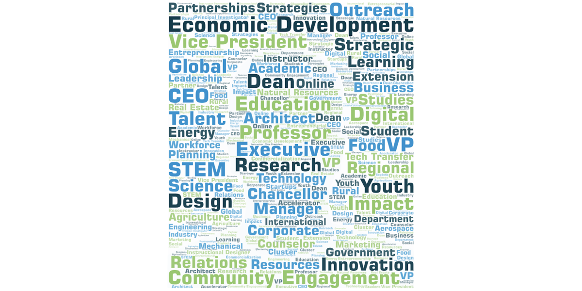 As the word cloud (above) of Venn Community member professional titles shows, participants in the community represent a wide cross-section of roles in community and economic development. "Economic Development" and "Community Engagement" appear frequently in member titles, along with words like "impact," "innovation," and "talent," and many others.